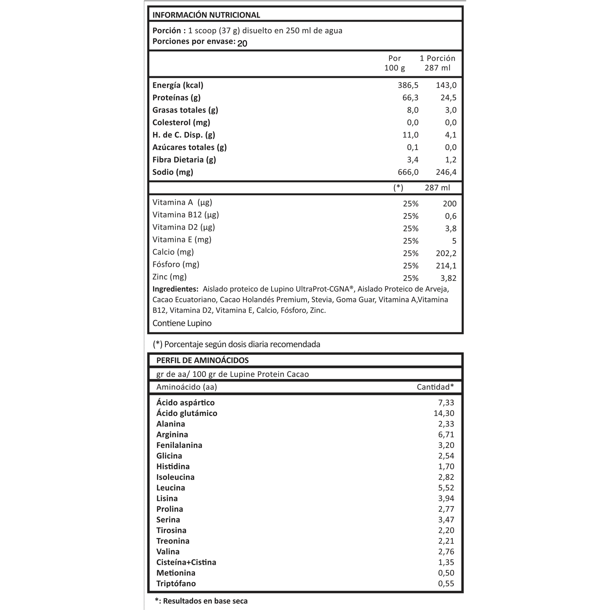Proteína vegetal en polvo elaborada en Chile, a base de lupino AluProt y proteína de arveja, con un perfil de aminoácidos complementario. Formulada con ingredientes 100% naturales, sin transgénicos, sin saborizantes artificiales ni azúcares añadidos.