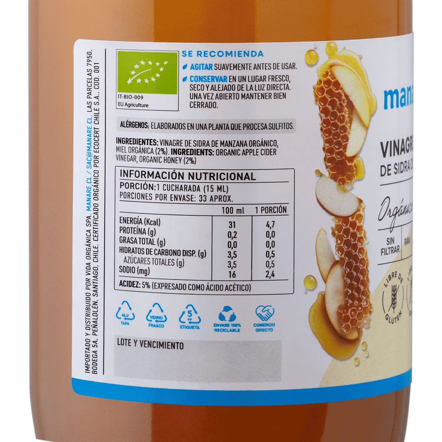 Vinagre de manzana con miel organico 500 ml Marca Manare